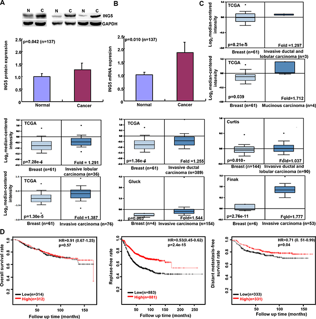 The individual gene expression level of ING5 was analyzed using Oncomine (www.oncomine.org), a cancer microarray database and web-based data mining platform for a new discovery from genome-wide expression analyses. We compared the differences in ING5 mRNA level between breast normal tissue and cancer. All data were log-transformed, median centered per array, and standard deviation normalized to one per array. The prognostic significance of ING5 mRNA was analyzed using Kaplan-Meier plotter (http://kmplot.com).