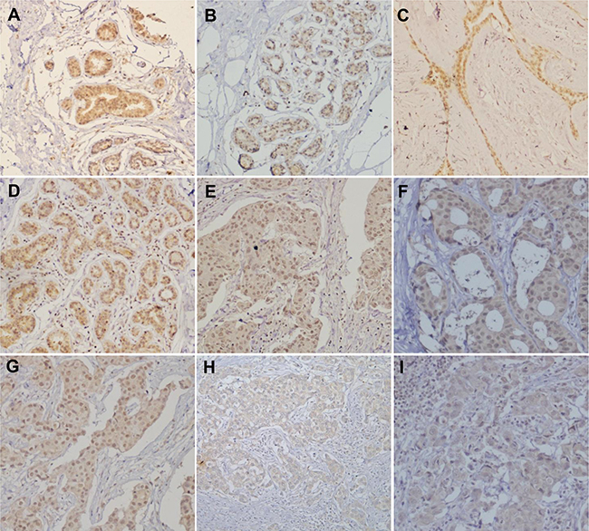 Figure 5: ING5 expression in breast carcinogenesis and subsequent progression. ING5 protein was positively expressed in breast duct (A: cyt,+++; nuc,+++), acinus (B: cyt,+; nuc,+++), fibroadenoma (C: cyt,++; nuc,+++), adenomatosis (D: cyt,++; nuc,+++), primary cancers (E–G: cyt,++; nuc,+++; H:cyt,++; nuc,-) and metastatic cancer (I: cyt,++; nuc,+) in lymph node. Note: cyt, cytoplasmic expression pattern; nuc, nuclear expression pattern.