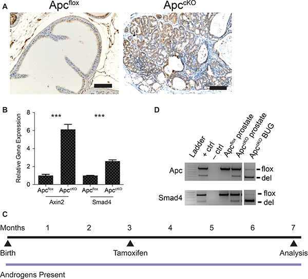 Figure 1: Rationale behind the Apc-Smad4 double knockout (ApccKOSmad4cKO) mouse model. (A) Smad4 immuno-staining on prostate tissue from Apcflox and ApccKO mice (scale bars = 100 μm); (B) Axin2 and Smad4 quantitative reverse-transcriptase PCR from Apcflox and ApccKO prostate tissue (error bars represent standard deviation based on technical triplicates; ***P value < 1 × 10–4); (D) allele-specific PCR for Apc and Smad4 showing the floxed band (flox) and the band as a result of deletion (del) in prostate and bulbourethral gland tissue; and (C) timeline of tamoxifen administration and sacrifice of control and experimental mice.