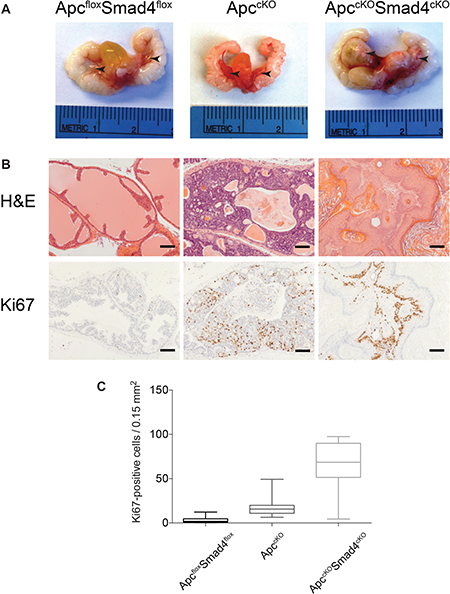 Figure 2: Proliferative increases in ApccKOSmad4cKO mice compared to ApccKO mice. (A) Urogenital tracts, including prostate tissue, from ApcfloxSmad4flox, ApccKO, and ApccKOSmad4cKO mice (arrows indicate the anterior prostate lobes); (B) H&E staining and Ki67 immuno-staining of prostate tissues (scale bars = 100 μm); and (C) Nuance microscope quantification of proliferating (Ki67-positive) cells in prostate cells from ApcfloxSmad4flox, ApccKO, and ApccKOSmad4cKO mice. For all groups, P value < 1.0 ×10−12.