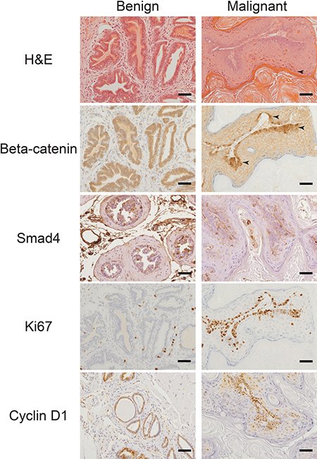 Figure 3: Gain of beta-catenin expression plus loss of Smad4 expression is associated with increased proliferation. Benign and malignant prostate tissue from ApccKOSmad4cKO mice were stained for hematoxylin and eosin (H&E) and immuno-stained for beta-catenin, Smad4, Ki67, and cyclin D1. Arrows point to regions keratohyalin granule formation and loss of nuclei (H&E stain) and regions of nuclear beta-catenin staining. Scale bars = 50 μm.