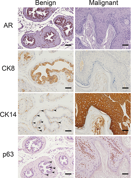 Figure 4: Concurrent loss of AR and luminal marker CK8 and expansion of basal markers CK14 and p63 in malignant tissue. Benign and malignant prostate tissue from ApccKOSmad4cKO mice were immuno-stained for androgen receptor (AR), cytokeratin 8 (CK8), cytokeratin 14 (CK14), and p63. Arrows point to representative positively stained CK14 and p63 basal cells. Scale bars = 50 μm.