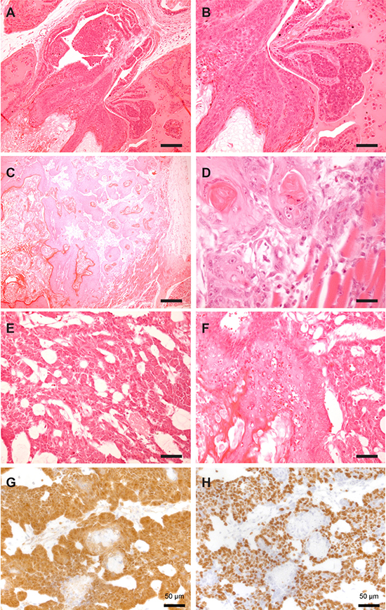Figure 5: Mix of differentiation phenotypes in ApccKOSmad4cKO tumors. Representative hematoxylin and eosin staining of prostate tumors from ApccKOSmad4cKO mice. Squamous in situ carcinoma (A–B); scale bars = 100 μm (A) and 200 μm (B). Squamous carcinoma with muscular invasion (C–D); scale bars = 250 μm (C) and 25 μm (D). Basaloid carcinoma (E); scale bar = 50 μm. Representative image of mixed basaloid and squamous cell carcinoma in the same region (F); scale bar = 50 μm. Representative images of basaloid region of prostate tumor stained with beta-catenin (G) and Ki67 (H); scale bars = 50 μm.