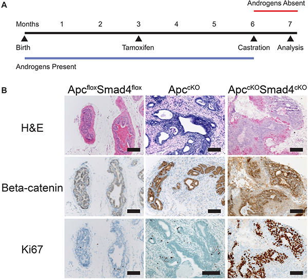 Figure 6: Tumors in ApccKOSmad4cKO mice are castration resistant. (A) Timeline of tamoxifen administration, castration, and sacrifice of control and experimental mice; and (B) representative images of prostate tissue from ApcfloxSmad4flox, ApccKO, and ApccKOSmad4cKO mice were stained for hematoxylin and eosin (H&E) and immuno-stained for beta-catenin and Ki67. Scale bars = 100 μm.