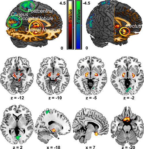 The most popular explanation of insomnia is hyperarousal or increased activities of neurons, metabolism in special areas of the brain and excretion by neuroendocrine systems [22]. Some researchers have proposed that subjects with CPI show a state of arousal and frequently experience intrusive worrisome or negative thoughts [23]. Therefore, people suffering from CPI find it difficult to initiate sleep or return to sleep after awakening due to this intrusive hyperarousal state [12]. In a previous SPECT study, CPI patients showed hypoperfusion in preselected regions, including the basal ganglia (the most decreased area), medial frontal cortex, occipital and parietal cortex, compared to good sleepers during sleep [19]. Nofzinger [20] used the PET method and found that patients with insomnia displayed increased global metabolism of glucose during both sleep and wakefulness. Moreover, patients with insomnia showed a smaller decrease in glucose cost from wakefulness to sleep in ascending reticular activating systems, the thalamus, hypothalamus and some regions related to cognition and emotion such as the hippocampus, insular, amygdala, prefrontal cortex and the anterior cingulate cortex [20]. Despite these findings, a consensus on the brain activity alterations of insomnia patients is lacking, but it is likely that insomnia is associated with regional metabolic abnormalities in regions of the brains and that these abnormalities are closely related to emotion and arousal.