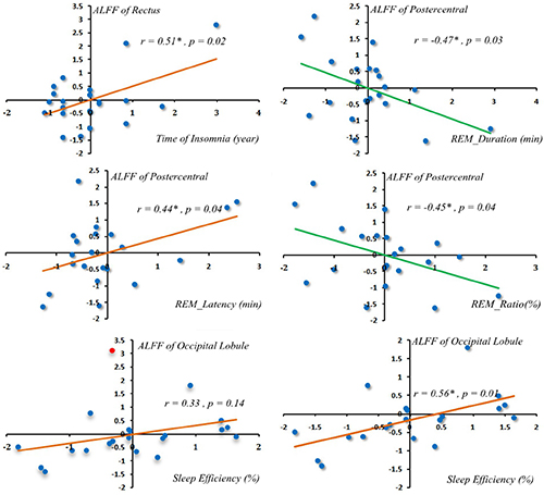Resting state functional magnetic resonance imaging (rs-fMRI) is an effective, non-radiation and non-intrusive tool that is broadly used in neurology research [24]. rs-fMRI can detect spontaneous neuronal activity and provide new insights on the pathophysiology of diseases [25]. Many neurological or mental diseases exhibit dysfunction of several distinct areas of the brain simultaneously. Previous studies have revealed synchronous activity of neurons as a necessary condition to exactly integrate and coordinate information processing [26]. Deterioration of information processing abilities and abnormalities in brain functions are observed if changes in neuronal or distinct brain synchrony occur [27]. The amplitude of low-frequency fluctuations (ALFF) is an index and its value is the average square root of power of spectrum, which is used to detect the regional spontaneous neuronal activity by rs-fMRI [28, 29]. ALFF reflects physiological signals and was higher in grey matter [24], It’s simple, easily implemented, reliable, and robust and exhibits good-to-moderate test-retest [30, 31], Fransson and Horovitz et al. applied ALFF to detect functional modulations and pathophysiological changes while awake and during light sleep [32, 33]. ALFF has been observed in brain areas associated with cognition and emotion, such as the dorsolateral prefrontal cortex, occipital gyrus and limbic system, in insomnia patients [34]. Hence, ALFF detected by rs-fMRI is helpful for exploring alterations of brain activity in neurological or psychosomatic diseases. However, the correlations between ALFF alterations and REM sleep have not been reported.