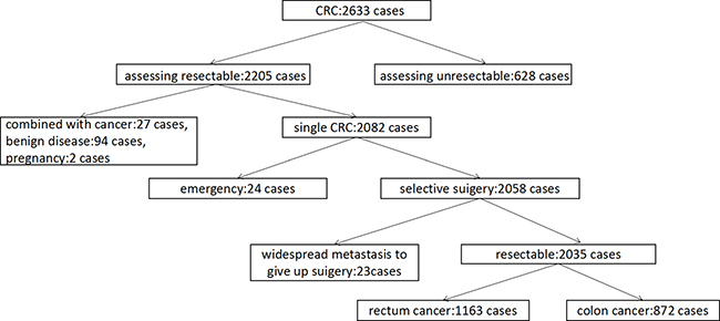 Figure 1: Scheme of selecting research subjects. After screening 2833 CRC cases for eliminating criteria including unresectable tumors, combined with other cancers, benign disease, pregnancy, emergency and widespread metastasis, 2035 CRC cancer patients were chosen for the study.