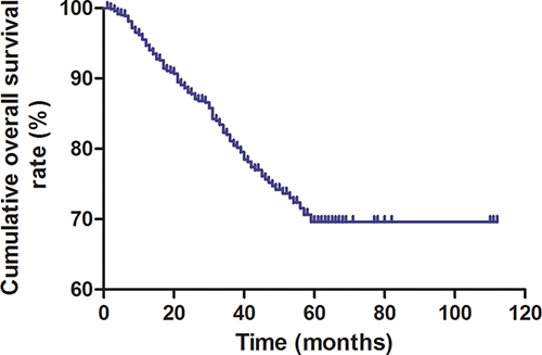 Figure 2: Kaplan-Meier survival curve of enrolled CRC patients. The Kaplan-Meier survival plot shows decreasing overall survival with post-operative time (months).