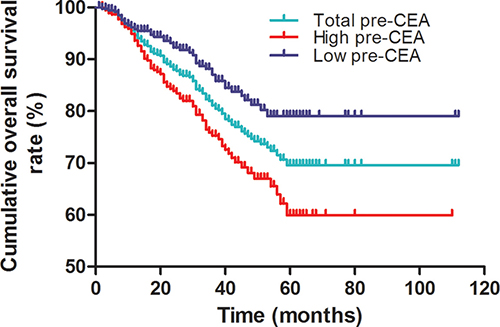 Figure 3: Kaplan-Meier survival curves of CRC patients based on pre-operative CEA levels. Overall survival of CRC patients with high (red) and low (blue) pre-operative CEA levels compared to total (green) CRC patients based on Kaplan-Meier curves and log-rank test. As shown, patients with low pre-CEA levels survived longer than those with high pre-CEA levels (log-rank test, P < 0.001).