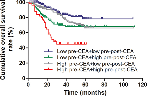 Figure 5: Kaplan-Meier survival curve analysis of different combinations of pre-CEA levels and pre-post-CEA ratios. CRC patients with low pre-CEA levels plus low pre-post-CEA ratio (blue) survived longer than those with high pre-CEA levels plus high pre-post-CEA ratios (red). CRC patients with low pre-CEA levels plus high pre-post-CEA ratios (green) and those with high pre-CEA levels plus low pre-post-CEA ratios (gray) show comparable survival rates (log-rank test, P > 0.05) and are intermediate in comparison to the previous two groups (log-rank test, all P > 0.05).