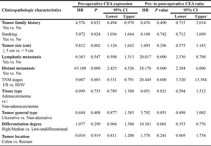 Table 1: Univariate analysis of relationship between pre-CEA levels and pre-post-CEA ratios with clinicopathological parameters of CRC patients