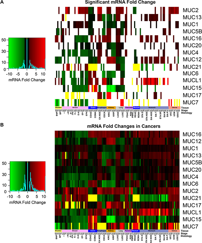 Figure 4: Mucin mRNA expression in cancer. mRNA cohorts were separated based on histology and stage, in which a minimum size of two was taken. Supplementary Table 1 contains the full cohort names and sample sizes. Fold change of mRNA in cancer was compared in relation to adjacent non-cancerous normal tissues. If either all the cancer or normal tissue had zero expression, the fold change was set to zero and colored yellow. (A) Cohorts which had a significant fold change as determined by a Mann-Whitney (p < 0.05) were colored. Cases where Mann-Whitney testing would be impractical had the yellow bars appear in the heatmap. All other cases (p > 0.05) have white where the fold change is insignificant statistically. (B) The fold change between normal tissue and the cancer cohort was displayed regardless of significance. Heatmap color scales are depicted on the left.