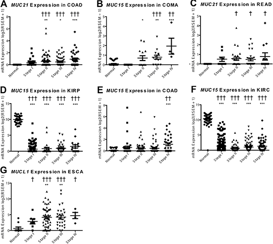 Figure 5: De novo expression and silencing of mucins in cancer. mRNA expression was plotted for the normal tissue and for each of the four stages in cancer. A Dunn’s test in prism was performed for mRNA differences compared to the normal expression (*p < 0.05; **p < 0.01; ***p < 0.001). Supplementary Table 3 Fisher’s exact test was consulted for significance (†p < 0.05; ††p < 0.01; †††p < 0.001) to examine if there is a significant change in the expression status, with expression being on or off. Histological subtypes examined include (A) MUC21 in COAD, (B) MUC21 in READ, (C) MUC15 in COMA, (D) MUC15 in COAD, (E) MUC15 in KIRP, (F) MUC15 in KIRC, and (G) MUCL1 in ESCA.