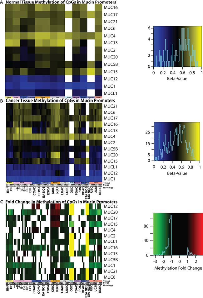Figure 7: Methylation status of mucins. Promoter methylation was examined in (A) normal tissue and (B) cancer genomes, as well as (C) the resulting fold change. Significant (p < 0.05) fold changes determined by a Mann-Whitney test are colored, where white indicates a non-significant change between normal and cancer promoters. A yellow bar indicates that a 27K methylation chip was analyzed instead of a 450K chip and the gene was not examined in the chip. A minimum sample size of two was required for each cohort. Supplementary Table 1 contains the full cohort names and sample sizes. Heatmap color scales are depicted on the right.