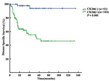 Figure 3: Disease Specific Survival analysis of 157 penile cancer patients stratified by CK2a immunoreactivity (positiveCK2α: final staining score of ≥6 ;negative CK2α: final staining score of <6). All statistical tests were two-sided. Significance level: P<0.001.