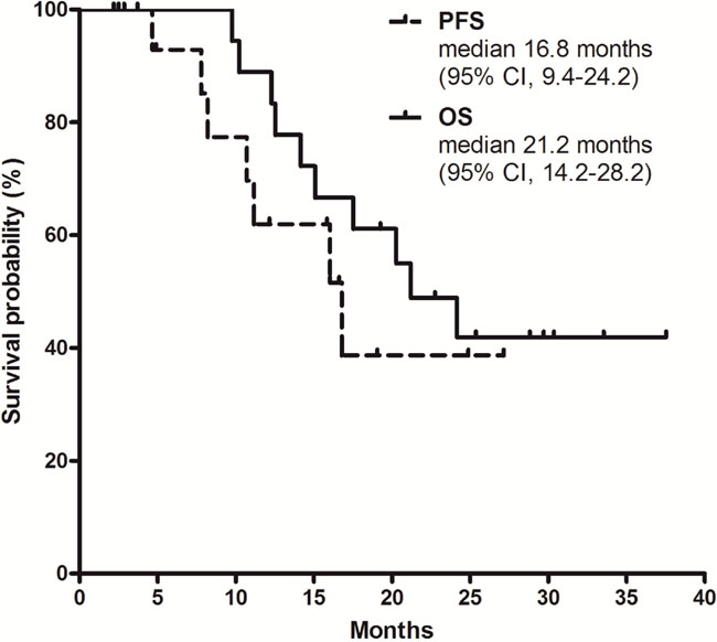 Partial response was achieved with neoadjuvant FOLFIRINOX in 6 patients (33%) and stable disease in 12 patients (67%). Surgical resection was performed in 12 patients, indicating a 66.7% resection rate after a median of 6 cycles of FOLFIRINOX (range, 4–13 cycles); R0 and R1 resection were achieved in 9 (75%) and 3 patients (25%), respectively. There were no patients with macroscopic residual disease (R2 resection). Vascular resections were performed in 9 patients (75%); the portal vein, celiac axis, superior mesenteric vein, and hepatic artery were resected in 4 (33%), 3 (25%), 2 (17%), and 2 (17%) patients, respectively. The post-treatment pathologic stage according to the American Joint Committee on Caner (AJCC) 7th edition was IIA in 7 patients (58%), IIB in 4 (33%), and III in 1 (8%). No patients achieved pathologic complete response. According to the College of American Pathologists (CAP) grading protocol [10], 5 (42%) and 7 (58%) patients were classified as grade 2 (moderate response; residual cancer outgrown by fibrosis) and grade 3 (poor or no response; extensive residual cancer), respectively. Following surgery, adjuvant chemotherapy and/or CCRT were performed in all but 2 patients (83%); 7 (58%) patients received chemotherapy alone (FOLFIRINOX in 4 [57%] and gemcitabine in 3 [43%]), 2 (17%) patients received CCRT alone and 1 (8%) received CCRT followed by chemotherapy (FOLFIRINOX). Adjuvant CCRT was performed for patients with margin-positive resection.