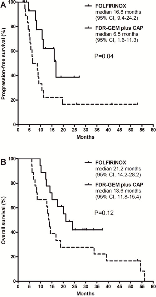 Figure 3: Progression-free survival (A) and overall survival (B) according to chemotherapy regimen (FOLFIRINOX vs. FDR-GEM plus CAP).