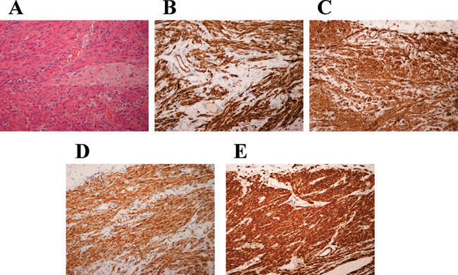 Figure 1: Histological examination of the leiomyoma of deep soft tissue of case 4. A. H&E-stained slide. B. Immunoexpression of actin. C. Immunoexpression of SMA. D. Immunoexpression of desmin. E. Immunoexpression of L-caldesmon. Magnification for all slides is x20.