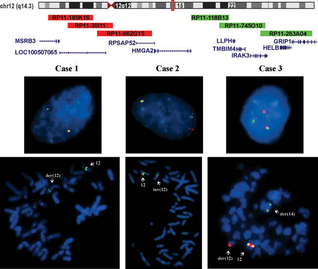 Figure 3: Interphase and metaphase FISH analyses of leiomyomas of deep soft tissue from group 1 with 12q anomalies. Ideogram of chromosome 12 with the location of HMGA2 (red box) and the BACs used for FISH experiments are shown. The 5´-end of the probe (red signal) was constructed from a pool of the clones RP11-185K16, RP11-30I11, and RP11-662G15. The 3´-end of the probe (green signal) was constructed from a pool of the clones RP118B13, RP11-745O10, and RP11-263A04. In case 1, the analysis showed absence of the red signal (deletion of the 5´-end of the probe) in both metaphase spreads and interphase nuclei. In case 2, interphase FISH showed split between red and green signals (5´-end and 3´-end probes). The FISH on metaphase spreads showed that the green signal (3´-end of the probe) was moved to 12p. In case 3, interphase FISH showed split between red and green signals (5´-end and 3´-end probes). The FISH on metaphase spreads showed that the green signal (3´-end of the probe) had moved to 14q.