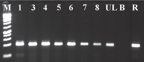 Figure 5: Expression of MED12 in leiomyomas of deep soft tissue. Gel electrophoresis of the RT-PCR amplified products. The primers MED12-Ex1-F/MED12-Ex3-R amplified a 163 bp cDNA fragment which contained part of exon 1, the entire exon 2, and part of exon 3 of the MED12 gene. All leiomyomas of deep soft tissue, except case 2, were examined (Lanes 1 and 3-8). M, 1 Kb DNA ladder (GeneRuler, Thermo Fisher Scientific). UL, uterine leiomyoma. B, Blank, water in cDNA synthesis. R, positive control, Human Universal Reference Total RNA (Clontech Laboratories, TaKaRa).