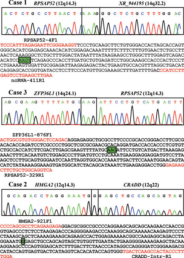Figure 6: RT-PCR results on fusion genes related to 12q/HMGA2 in cases 1, 3, and 2. The amplified cDNA fragments were direct sequenced. The partial chromatograms, which are shown, contain the fusion points. The chromosome locations of the fusion partners are shown in parentheses. The amplified cDNA sequences are also shown. Primers are in red. Common nucleotides found at the fusion points are shown in green boxes.