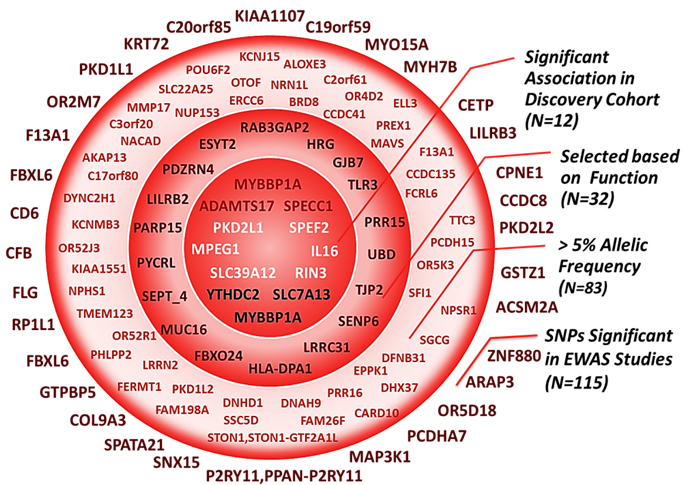 Figure 1: The selection process following the exome-wide association study. Top-ranking signals from the EWAS (N = 115) were filtered through a multi-step selection process explained on the right-side of the figure. Each circle contains all the SNPs that are inside of it, including the ones in the smaller circles. Inner circle represent significant associations with one of the 3 asparaginase related toxicities (N = 12) retained for analysis in replication cohort. rs3809849 in MYBBP1A was significantly associated both with allergy and pancreatitis in the EWAS study.