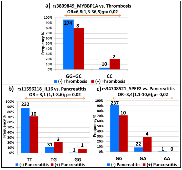 In the light of their positive association, each SNP was tested for possible associations with the two other side-effects. Interestingly, on the top of their association with allergy and pancreatitis, homozygote carriers of the variant rs3809849 allele in the MYBBP1A gene were associated with a higher risk of thrombosis (OR = 6.8; 95% CI, 1.3-36.5; p = 0.02; Figure 2a); whereas, rs11556218 in IL16 and rs34708521 in SPEF2 were, in addition to thrombosis, also correlated with pancreatitis (OR = 3.1; 95% CI, 1.1-8.6; p = 0.02 and OR = 3.4; 95% CI, 1.1-10.6; p = 0.02; Figures 2b and 2c, respectively).