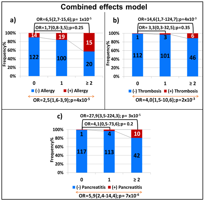 Figure 4a), whereas the presence of 2 or more variant alleles was associated with a 6.5-fold increase in the risk of experiencing allergic reactions as compared to not carrying any variant allele (OR = 6.5; 95% CI, 2.7-15.6; p = 1X10-5, Figure 4a). Similar effect was noted for thrombosis (OR for additive effect = 4.0; 95% CI, 1.5-10.6; p = 0.002, Figure 4b). As for pancreatitis, the addition of all 3 variants in the model increased the risk 6-fold (OR = 5.9; 95% CI, 2.4-14.4; p = 7x10-6, Figure 4c) with carriers of at least two variant alleles being almost 28 times more at risk as compared to those without any variant allele (OR = 27,9; 95% CI, 3,5-224,3; p = 3X10-5, Figure 4c).
