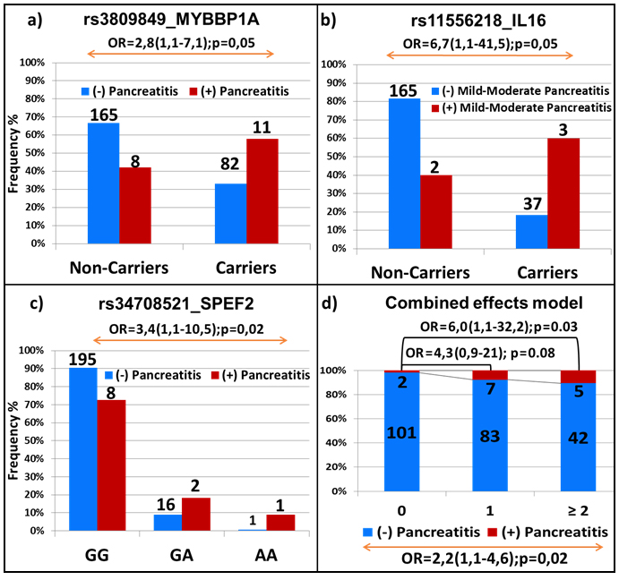Figure 5: Replication analysis in the independent validation cohort. Association of pancreatitis with genetic variations in MYBBP1A a., IL16 b., SPEF2 c. and in combined effect model d. The frequency of patients with and without pancreatitis in a., b. and c. is represented by red and blue bars, respectively. The number and the genotypes are indicated. Combined-effect model in d. includes SNPs identified for association with pancreatitis through EWAS of discovery cohort (i.e. rs72755233 in ADAMTS17, rs3809849 in MYBBP1A and rs9908032 in SPECC1). Each bar represents the number of the variant alleles present (i.e. none, one, two or more). The frequency of patients with and without toxicity is represented by the red and blue part of the bar, respectively. The number of samples per category is displayed inside of the bars. The OR with the 95% CI is given when compared to patients with no variants allele (top of the graph) and across groups (bottom of the graph).