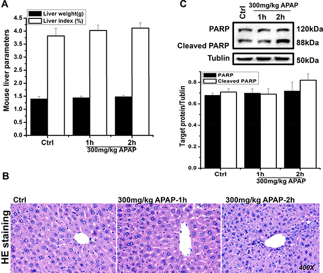 Figure 1: Biological characterization of the effect of APAP on mouse liver cell functions. The recorded data exhibited no significant difference in liver mass of APAP-treated and APAP-free mice (A). HE staining (magnification 400×) revealed no liver impairment in APAP-exposed livers (B). Western blotting data showed no statistically significant difference in early apoptosis-related PARP and cleaved-PARP expression in all liver samples (C).
