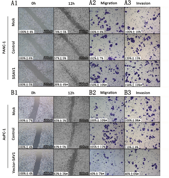 Figure 3: Influence of SAV1 expression on migration and invasion of pancreatic cancer cells. For cell scratch wound assay, PANC-1 (A1) and AsPC-1 cells (B1) were transfected with siSAV1 and pLenti-EF1a-EGFP-P2A-Puro-CMV-SAV1-3Flag for 48 hours, resprectively. The cultures were then wounded by scratching and maintained for additional 12 hours. Cell cultures were photographed and migration was measured by the cell-free areas in multiple fields (inserted number represented the percentage of gap areas±SD). The migration and invasion of PANC-1 (A2 and A3) and AsPC-1 (B2 and B3) cells were analyzed by the cell migration and invasion assays as described in the Materials and Methods. Representative cancer cell migrated or invaded were photographed, data represent mean±SD of triplicates. Note: *, P<0.05 (one way ANOVA) in a comparison of the siSAV1 or vector-SAV1treated groups with the mock and control groups.