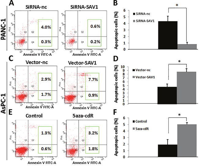 Figure 4: Influence of SAV1 expression on apoptosis of pancreatic cancer cells. (A) and (B) Knockdown of SAV1 repressed the apoptosis of PANC-1 cells. (C) and (D) Overexpression of SAV1 promoted the apoptosis of AsPC-1 cells. (E) and (F) AsPC-1cells treated with the demethylating agent 5-azaC resulted in restored expression of SAV1. Furthermore, restored SAV1 promoted the apoptosis of AsPC-1 cells.