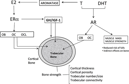 Figure 1: Effects of sex steroids on bone. Androgens like T can be converted via aromatization to estrogens and can thus activate both AR and ERα. In males, both AR and ERα maintain cortical and trabecular bone in adult male. Estrogens increases osteoblast number and activity, inhibit osteocyte apoptosis, reduces the number and activity of osteoclasts. Androgen directly increase number and function of osteoblasts and inhibit apoptosis of osteocytes. Osteoclasts apparently do not express AR. Trabecular bone formation is increased by ERα in males, whereas both ERα and AR can inhibit trabecular bone resorption. ERα inhibits endosteal bone resorption and with GH/IGF-1 (probably via central aromatization of androgens) stimulates periosteal bone formation). The action of GH/IGF-1 axis in particularly evident during puberty. E2 : estradiol; T: testosterone; DHT dihydrotestosterone; Era: estrogen a-receptor; AR: androgen receptor; OB: osteoblast; OC osteocyte; OCL :osteoclast; GH: growth hormone; IGF-1: insulin growth-factor;.