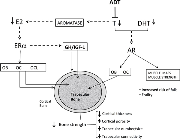 Figure 2: Mechanisms of bone loss in men with prostate cancer receiving androgen deprivation therapy. Androgen deprivation therapy reduces testosterone levels and indirectly the estrogen levels in man. The low serum and tissue levels of estrogen increase bone turnover increasing the number of BMU and increasing the number of osteoclasts. The low levels of estrogen increase endosteal reabsorption and cortical porosity. Androgen and estrogen deficiency reduces the thickness and the number of trabeculae and high bone turnover reduce trabecular connectivity, predisposing to bone fragility. Sarcopenia increases risk of falls and indirectly impairs bone metabolism. E2 : estradiol; T: testosterone; DHT dihydrotestosterone; Era: estrogen a-receptor; AR: androgen receptor; OB: osteoblast; OC osteocyte; OCL :osteoclast; GH: growth hormone; IGF-1: insulin growth-factor; ADT: Androgen deprivation therapy; Dotted-line: lack of action