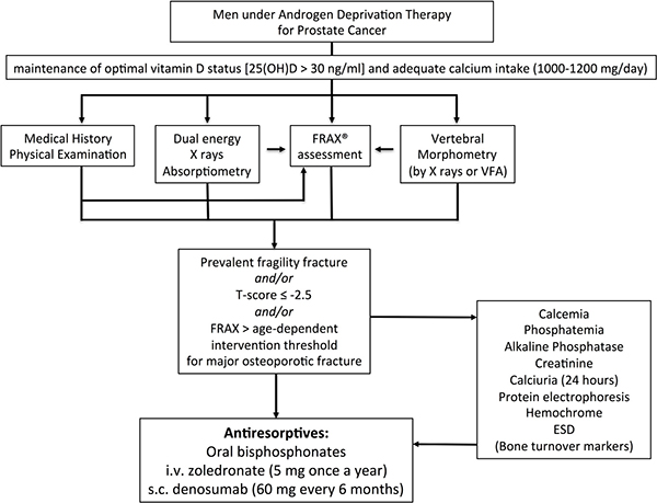 A review of the available literature has been carried out. Papers were retrieved by means of a PubMed enquiry (up to November 2015) using the following terms: “prostate cancer”, “epidemiology”, “androgen deprivation therapy” and/or “adjuvant therapy” AND “osteoporosis”, “fractures”, bone fragility”, “bone remodeling”, “bone turnover”, BMD, “skeletal homeostasis”, “bone metabolism”, “fracture risk assessment”, FRAX”, “muscle”, “sarcopenia”, “antiresorptives”, “bisphosphonates”, or active principle of bisphosphonates (such as pamidronate, alendronate, risedronate, zoledronate), “denosumab”, “calcium”, “vitamin D”, “cost effectiveness analysis”. International guidelines from Cancer and Bone Societies and have been taken into account and integrated. Data were retrieved, summarized, and incorporated in order to provide an objective, complete description of the available evidence. Finally, main review articles on the subject were retrieved and appropriately cited.
