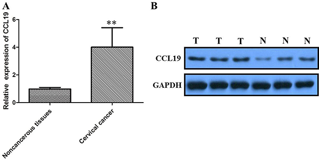 Figure 2: (A) qRT-PCR showing expression level of CCL19 mRNA in cervical cancer tissue; (B) Western blots showing the expression of CCL191 protein in cervical cancer tissue; *P < 0.05, **P < 0.01.