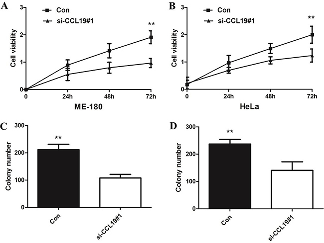 Figure 4: (A) CCK8 assay showing knockdown of CCL19 inhibited cell proliferation of ME-180 cells; (B) CCK8 assay showing knockdown of CCL19 inhibited cell proliferation of HeLa cells; (C) Colony-formation assays showed that silencing of CCL19 significantly increased the colony-forming ability of ME-180 cells; (D) Colony-formation assays showed that silencing of CCL19 significantly increased the colony-forming ability of HeLa cells; *P < 0.05, **P < 0.01.
