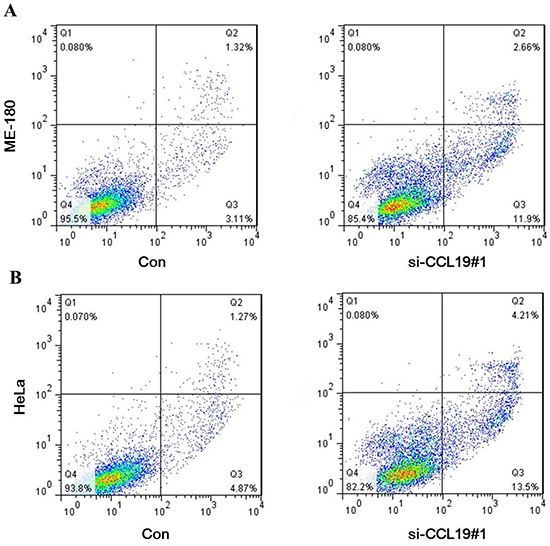 Figure 5: (A) Down-regulation of CCL19 expression by siRNA increased apoptosis in ME-180 cells; (B) Down-regulation of CCL19 expression by siRNA increased apoptosis in HeLa cells;
