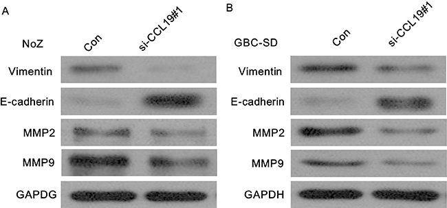 Because EMT is the remarkable presentation for cell invasion, whether silencing CCL19 expression inhibited mesenchymal features need to be identified. As showed in Figure 7, Vimentin and N-cadherin were downregulated after CCL19 knockdown while E-cadherin was overexpressed in ME-180 and HeLa cells. Therefore, inhibition of CCL19 in cervical cancer cells makes the cell phenotype be more epithelial rather than mesenchymal. Recent studies suggest that MMP2 and MMP9 modulate cell migration and lineage development. Our results showed that MMP2 and MMP9 were found to be markedly downregulated after CCL19 interference (P < 0.001).