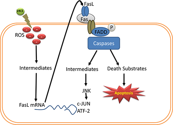 Apoptosis is characterized by specific morphological changes such as nuclear condensation and fragmentation, membrane blabbing and formation of apoptotic bodies [101]. VK has been shown to induce apoptosis through functional activation of Fas/FasL signaling in Jurkat cells [102]. Several external stimuli such as T-cell receptor (TCR) ligation, UV and gamma irradiation and drugs are able to induce apoptosis by upregulating FasL through the activation of transcription factors like nuclear factor of activating T-cells and NF-kB [102, 103]. Ligation of the TCR induces the expression of FasL which is dependent on c-myc expression. c-Myc may function as transcription factors to induce apoptosis when deprived growth factors and this c-myc-induced cell death may be mediated by cell surface interaction of Fas with its ligand (FasL) [104, 105].