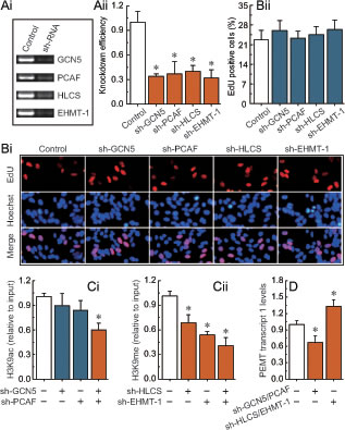 Fig 5: H3K9ac and H3K9me-mediated transcriptional regulation of PEMT in BRCA1-mutated breast cancer cells. Ai, RT-PCR showing GCN5, PCAF, HLCS, and EHMT-1 levels before and after knockdown by shRNAs, and normalized to β-actin expression. Aii, the results from three independent experiments are represented as mean ± SD. Bi, EdU labeling showing the proliferation of GCN5-, PCAF-, HLCS-, and EHMT-1-silenced in primary BRCA1-mutated breast cancer cells (each group, n = 68). Blue, Hoechst 33342 labeling of cell nuclei; red, EdU labeling of nuclei of proliferative cells. Bii, the EdU incorporation rate was expressed as the ratio of EdU-positive cells to total Hoechst 33342-positive cells. Ci, analysis of histone modification H3K9ac enrichment around the -132 site after the deletion of GCN5 and PCAF in primary BRCA1-mutated breast cancer cells (each group, n = 68). Cii, analysis of histone modification H3K9me enrichment around the -132 site after the deletion of HLCS and EHMT-1 in primary BRCA1-mutated breast cancer cells (each group, n = 68). D, PEMT transcript 1 levels after the deletion of H3K9ac and H3K9me around the -132 site in primary BRCA1-mutated breast cancer cells (each group, n = 68). Bar graphs show mean ± SD. * P < 0.05 vs. control.
