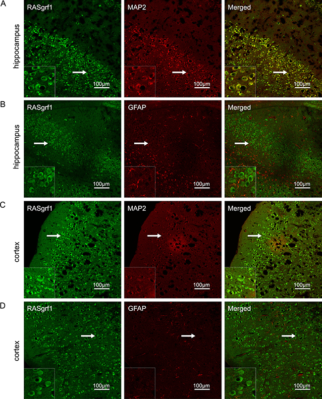 Figure 1: RASgrf1 double-labeling immunofluorescence in brain sections from KA-treated mice. (A, B) In the CA3 region of the hippocampus, RASgrf1 (green) was co-expressed (merged) with MAP2 (red) in neurons (A) but not with GFAP (red) in astrocytes (B). (C, D) In the cortex, RASgrf1 (green) was co-expressed (merged) with MAP2 (red) in neurons (C) but not with GFAP (red) in astrocytes (D) (scale bar is 100 μm). A magnified view of the area indicated by the white arrows is located in the lower left corner (scale bar is 30 μm).