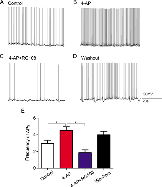 Figure 3: The effect of the DNMT antagonist RG108 on 4-AP medium-induced bursts of APs. (A) The APs in hippocampal CA1 neurons of nontreated (control) brain slices. (B) Continuous bursts of APs occurred in the hippocampal CA1 neurons of brain slices as a result of 4-AP treatment. (C) After posttreatment with RG108, APs in the hippocampal CA1 neurons were significantly suppressed. (D) After the slices were washed with 4-AP, APs increased to some extent. (E) Quantitative analysis results for the AP frequencies in the different groups are shown. *P < 0.05 (n = 5). The membrane potential was maintained between −50 mV and −60 mV throughout the recording.