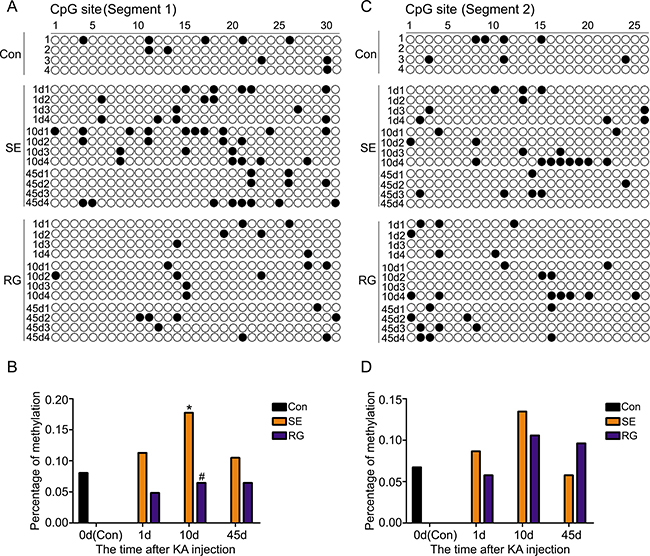 Figure 4: The effect of RG108 pretreatment on RASgrf1 methylation at different time points after the onset of epileptic seizures. (A, B) Bisulfite sequencing shows the methylation of RASgrf1 promoter segment 1 (31 CpG sites) in control mice (control group), KA-treated mice (SE group) and RG108-pretreated mice (RG group) at different time points. There was an increase in the methylation of RASgrf1 after the onset of epileptic seizures, *P < 0.05, compared with the control group. RG108 pretreatment inhibited the increase in the methylation of segment 1, as shown 10 days after the onset of epileptic seizures, #P < 0.05. (C, D) Bisulfite sequencing shows the methylation of RASgrf1 promoter segment 2 (26 CpG sites) in control mice (control group), KA-treated mice (SE group) and RG108-pretreated mice (RG group) at different time points. Compared with the control group, RASgrf1 methylation did not show a regular change at segment 2, nor did RG108 significantly affect segment 2 after the onset of epileptic seizures. Filled circles represent methylated CpG sites, and open circles represent unmethylated CpG sites (each group n = 4).