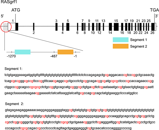Figure 6: Genomic structure of RASgrf1 and sequencing of its methylated segments. The exons of RASgrf1 are represented as black boxes with the numbers above. Open boxes represent either 5′ or 3′ untranslated regions (UTRs). The dotted part represents the promoter of RASgrf1, and a magnified view of the promoter area indicated by the red circle is located under the circle. Segment 1 (-1210/-862) and segment 2 (-395/-49) (the transcription start site is defined as +1) DNA sequences of the 5′-end of the RASgrf1 gene are displayed in the figure. Highlighted in red: the CpGs analyzed. The figure were assembled using data from the UCSC genome browser (http://genome.ucsc.edu/).