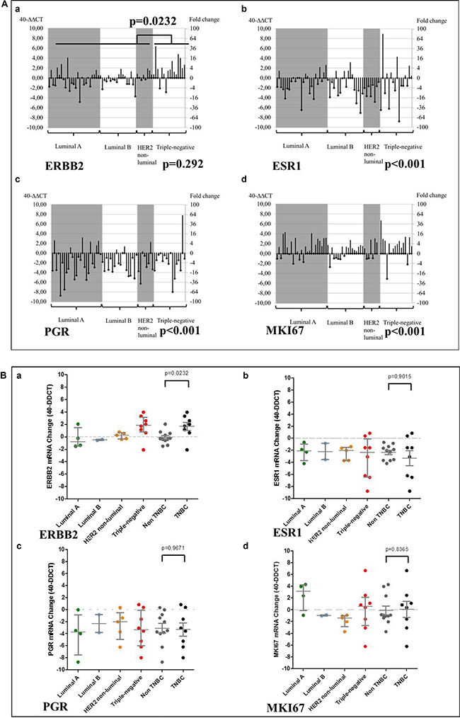 Figure 2: Changes from PT baseline in the MT mRNA levels of tumor biomarkers, by tumor subtype. (A) 40−ΔΔ Cq; (B) Mann–Whitney test.