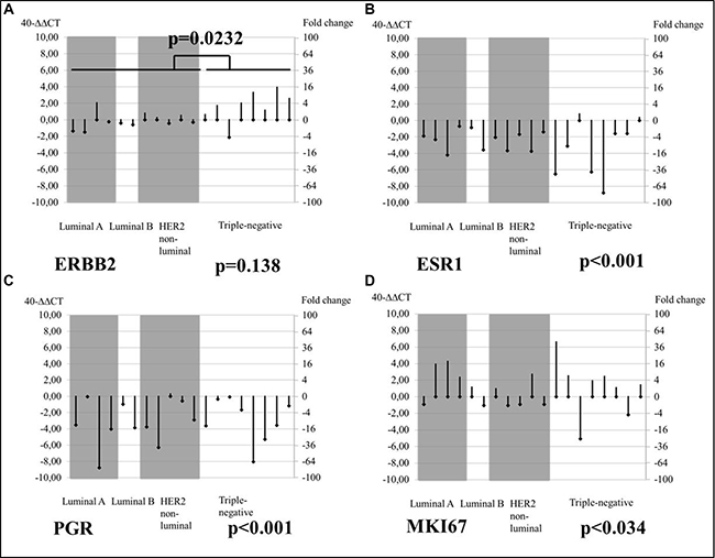 Apart from substantial biomarker conversion at the mRNA/protein level or even clonal evolution as genetic alterations – mainly hotspot mutations [24–29], another potential scenario behind the conversion of tumor biomarker is due to technical limitations of dichotomous biomarker assessment via conventional IHC. Exact quantification of the underlying target gene and protein expression could essentially facilitate exploration of tumor biomarker conversion upon disease progression, and therefore the present study used a highly standardized real-time quantitative polymerase chain reaction (RT-qPCR) kit to compare the expression levels of the ESR1, PGR, ERBB2, and MKI67 genes in matched pairs of BC PT and MT samples. In addition, matched results from conventional immunohistochemistry assessments of the same biomarkers were compared to address the concordance or discordance between the mRNA and protein assessments.