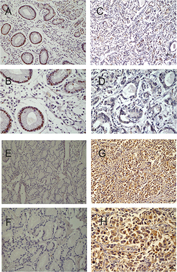 Figure 2: (A) Positive expression of P57/Kip2 in the adjacent non-cancerous tissues (×20). (B) Positive expression of P57/Kip2 in the adjacent non-cancerous tissues(×40). (C) Negative expression of P57/Kip2 in GCA (×20). (D) Negative expression of P57/Kip2 in GCA(×40). (E) Negative expression of CyclinD1 in the adjacent non-cancerous tissues(×20). (F) Negative expression of CyclinD1 in the adjacent non-cancerous tissues(×40). (G) Positive expression of CyclinD1 in GCA(×20). (H) Positive expression of CyclinD1 in GCA(×40).