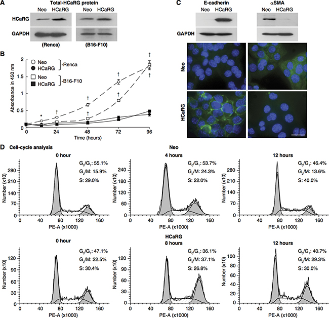Figure 1: HCaRG facilitates differentiation of Renca cells and inhibits cell-cycle progression. (A) Total (exogenous and endogenous) HCaRG protein levels, revealed by western blot, were higher in HCaRG-Renca and HCaRG-B16-F10 cells than in Neo-control cells. (B) Cell growth curves of Renca and B16-F10 clones. HCaRG-Renca and HCaRG-B16-F10 cells proliferated less than Neo-controls. †P < 0.005. (C) Western blot and immunostaining of differentiation markers in Renca clones. E-cadherin was detected only in HCaRG-Renca cells while αSMA expression was lower in HCaRG-Renca than in Neo-Renca cells. HCaRG promoted differentiation of Renca cells. Scale bars, 50 μm. (D) Cell-cycle analysis by DNA content in Renca cells. Representative cell-cycle DNA histograms showed the effect of HCaRG overexpression on cell-cycle progression in Renca cells. The maximal peak of G2/M accumulation was observed at 4 hours in Neo-Renca and at 8 hours in HCaRG-Renca cells, respectively. HCaRG delayed cell-cycle progression by 4 hours with G2/M cell-cycle accumulation. G0/G1, G2/M and S phases are shown.