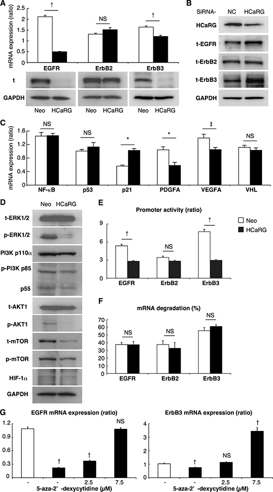 Figure 4: HCaRG suppresses EGFR and ErbB3 by enhancing their promoter methylation. (A) The expression of total (t) ErbB receptors was demonstrated by Real-Time PCR and western blot. HCaRG overexpression reduced EGFR and ErbB3 expression at the mRNA and protein levels in Renca cells. ErbB2 mRNA and total protein levels were not modified by HCaRG overexpression. †P < 0.005. NS, not significant. (B) Knockdown of HCaRG with siRNA treatment in WT-Renca cells. siRNA-HCaRG treatment reduced HCaRG protein expression compared to a negative control (NC) and led to up-regulation of EGFR and ErbB3. ErbB2 expression was not changed by siRNA against HCaRG. (C) The effect of inhibition of MAPK and PI3K/AKT signals on downstream genes was demonstrated by Real-Time PCR in Renca cells. The decrement of HIF-1α and subsequent VEGFA and PDGF genes was caused by HCaRG overexpression independent of the expression of anti-oncogene of RCC, VHL. ‡P < 0.05, *P < 0.01, †P < 0.005. NS, not significant. (D) Renca lysates were analyzed by western blot using appropriated antibodies. Representative blots show the inactivation of subsequent MAPK and/or PI3K/AKT signaling pathways by HCaRG overexpression. (E) HCaRG inhibits the transcriptional activity of EGFR and ErbB3 at the promoter level. Human EGFR, ErbB2 and ErbB3 5′ flanking regions containing their respective promoters were cloned and transfected into Neo- or HCaRG-Renca cells. HCaRG overexpression repressed the promoter activities of EGFR and ErbB3, but not of ErbB2. Promoter activity was normalized to the activity of pGL4.74-TK control vector. ‡P < 0.05, †P < 0.005. (F) mRNA degradation of ErbB receptors was tested by inhibiting their transcription with α-amanitin. mRNA levels were normalized to polymerase I-dependent transcription of the 28S ribosomal gene. mRNA degradation was presented as percentage of mRNA levels relative to controls without α-amanitin. HCaRG did not cause mRNA degradation after 24 hours. (G) Demethylation of promoter DNA with treatment of 5-aza-2’-deoxycytidine rescued and/or increased mRNA levels of EGFR and ErbB3 in HCaRG-Renca cells in a dose-dependent manner. ‡P < 0.05, †P < 0.005.